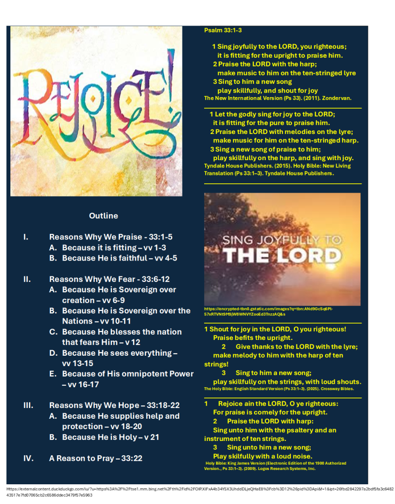 Not all the reasons, of course, but reasons stated in the first 5 verses of Psalm 33. I say stated, because there are many reasons implied throughout the Psalm. Even the subpoints under the headings aren’t exhaustive or consistent. For example, the subheadings under the first heading covering verses 1-5 need to be expanded on. And as you see, I used alliteration. In contrast, the subheadings under II-IV are not alliterative. But that’s enough clarification and self-criticism.